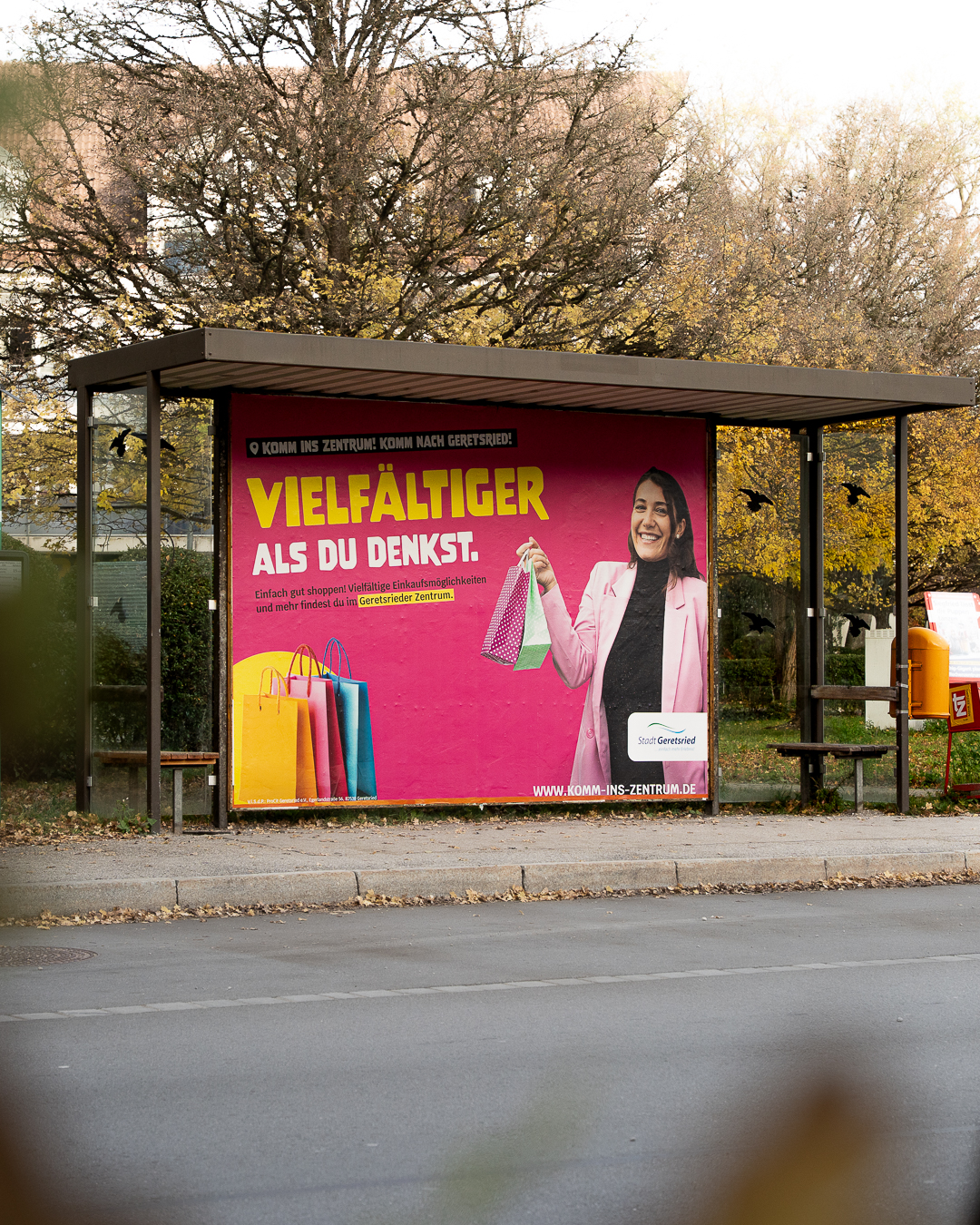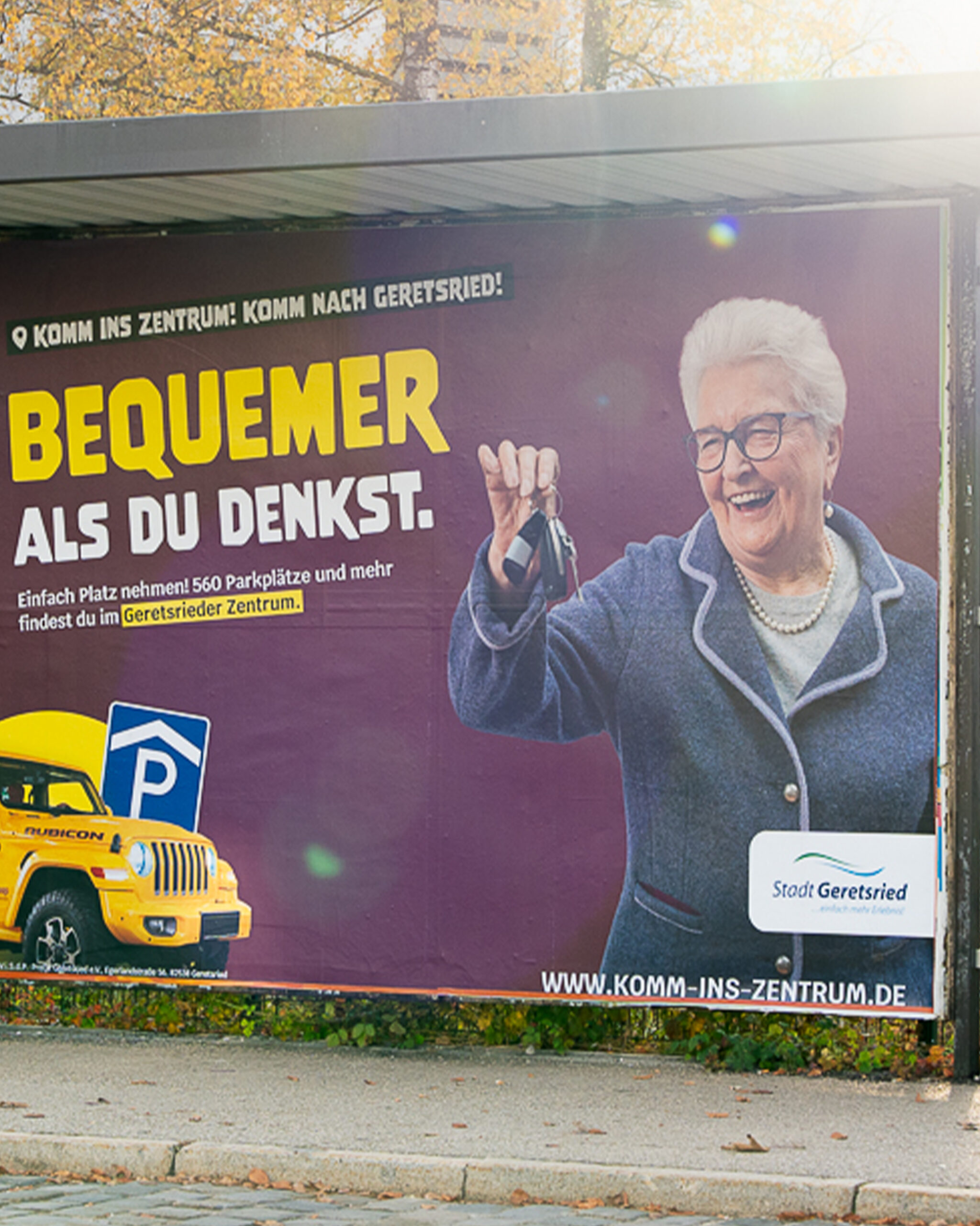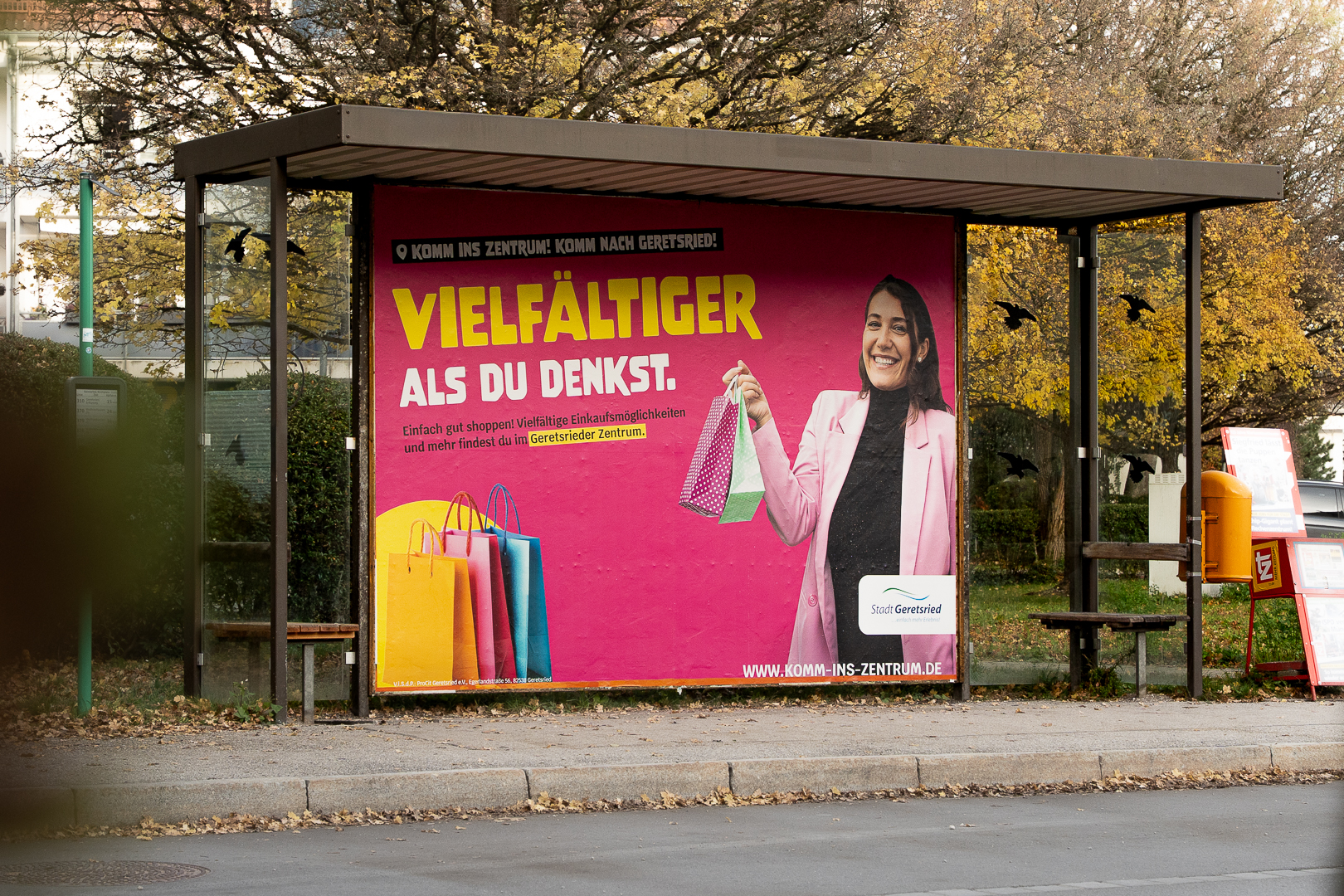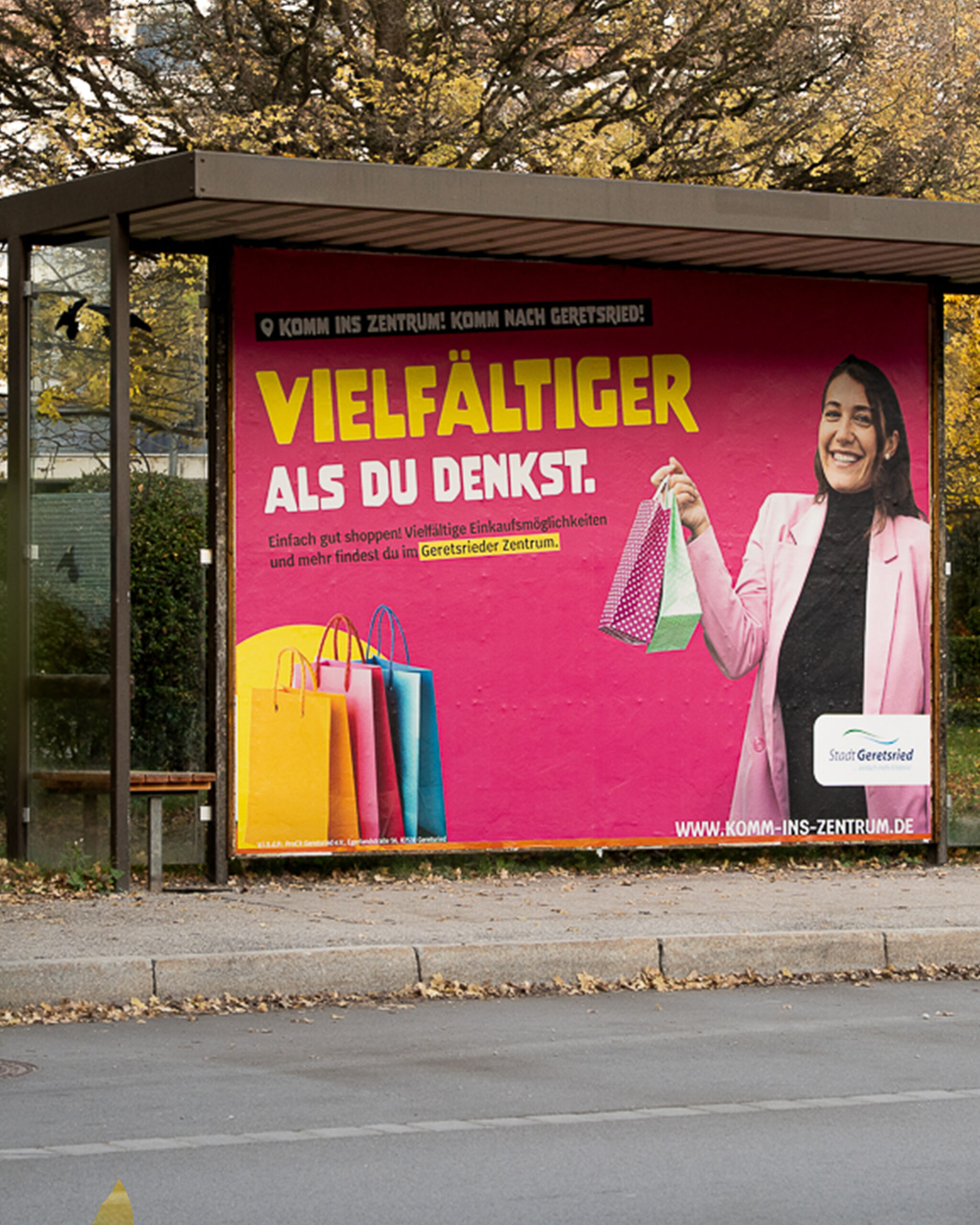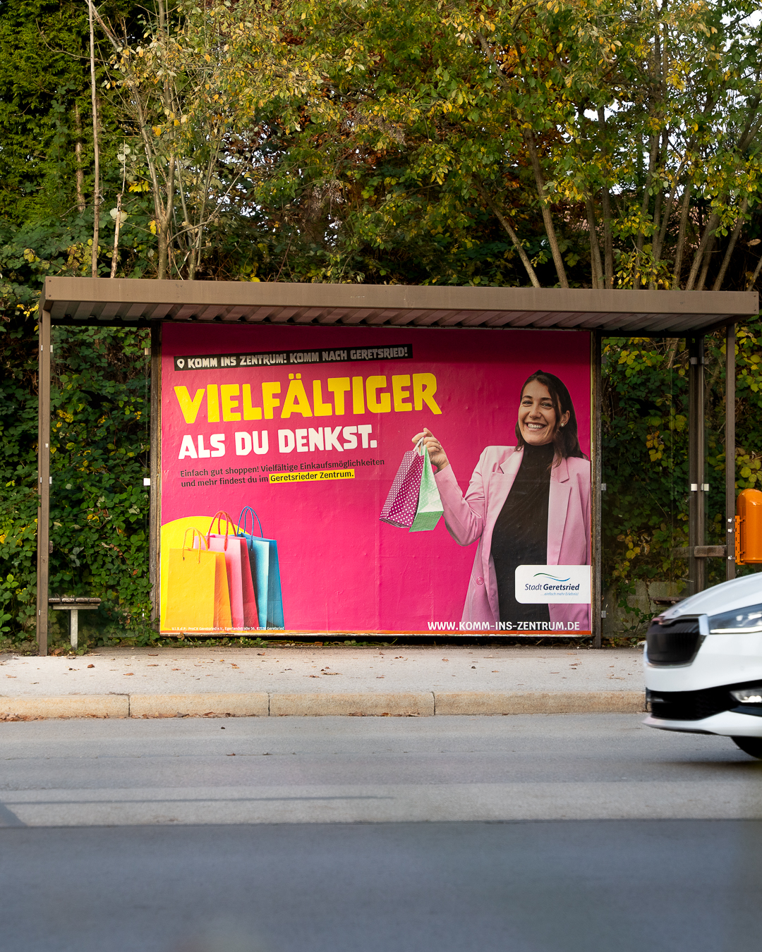 Für die City-Kampagne ProCity Geretsried „KOM ins Zentrum“ in der Stadt Geretsried haben wir gemeinsam mit der Werbe- und Kreativagentur Stileffekt GmbH die gesamte Umsetzung der Kanpangne übernommen – von großflächigen Plakaten über Bushaltestellen-Werbung bis hin zu drei hochwertig produzierten Werbespots. Die visuellen Medien sind im gesamten Stadtgebiet sowie im Landkreis an Plakatwänden und Stationen präsent und unterstreichen den professionellen Auftritt einer starken Innenstadt-Marke.