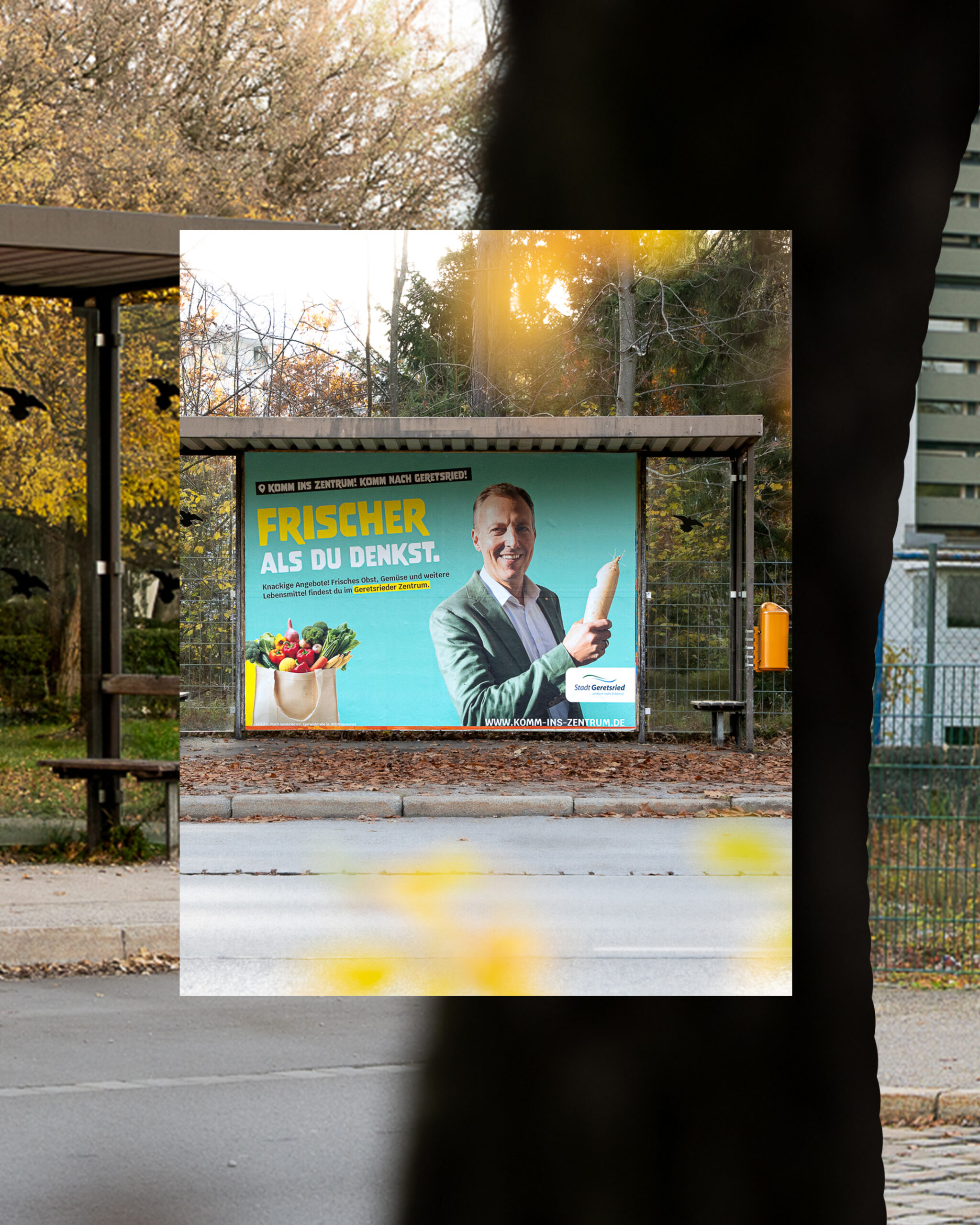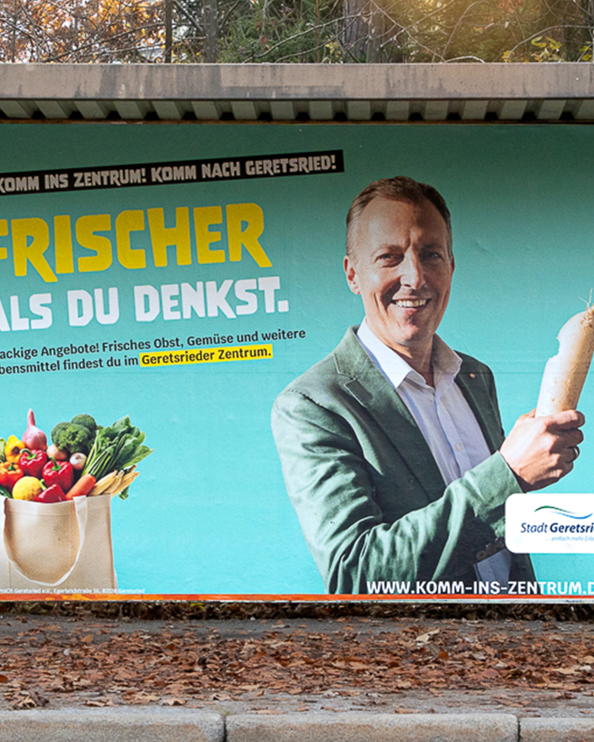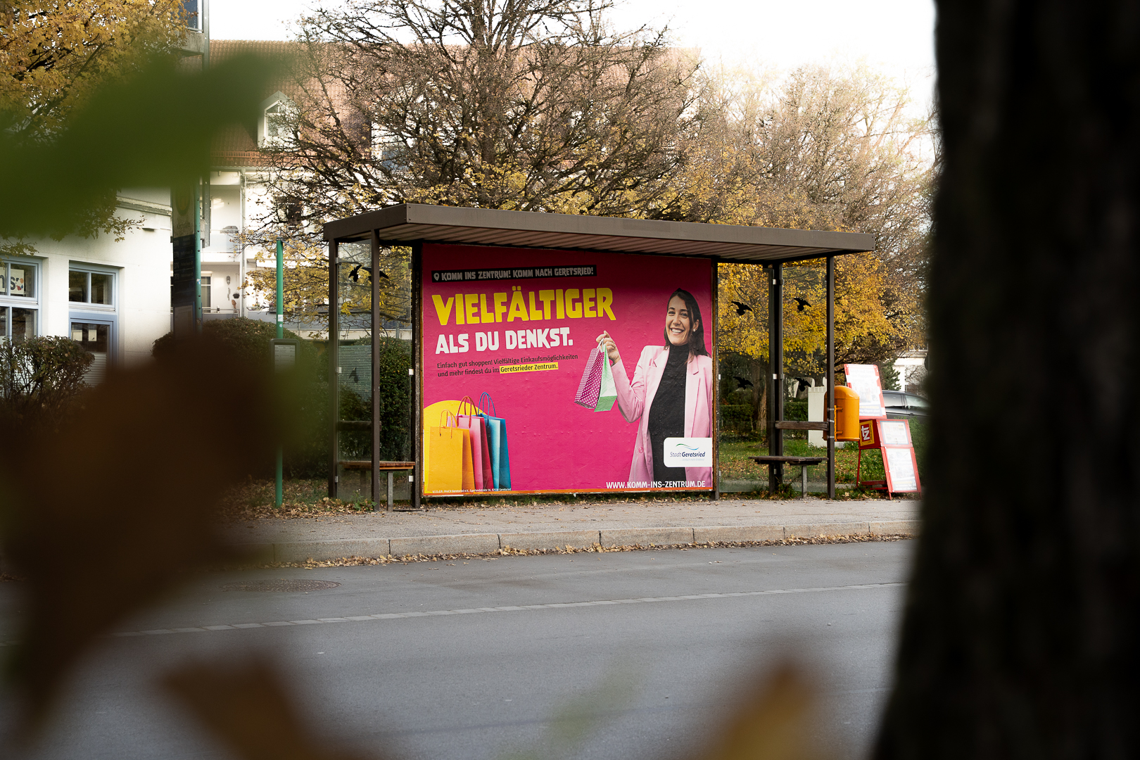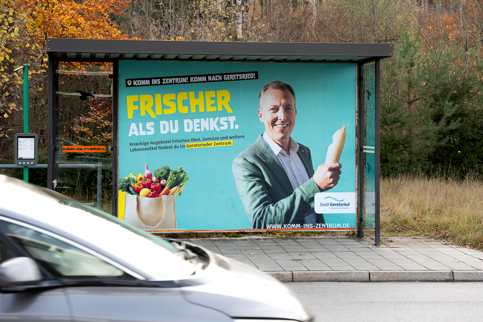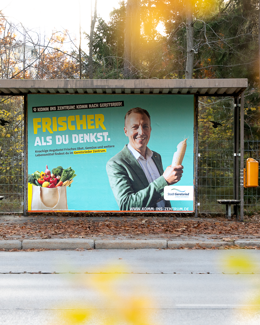 Für die City-Kampagne ProCity Geretsried „KOM ins Zentrum“ in der Stadt Geretsried haben wir gemeinsam mit der Werbe- und Kreativagentur Stileffekt GmbH die gesamte Umsetzung der Kanpangne übernommen – von großflächigen Plakaten über Bushaltestellen-Werbung bis hin zu drei hochwertig produzierten Werbespots. Die visuellen Medien sind im gesamten Stadtgebiet sowie im Landkreis an Plakatwänden und Stationen präsent und unterstreichen den professionellen Auftritt einer starken Innenstadt-Marke.