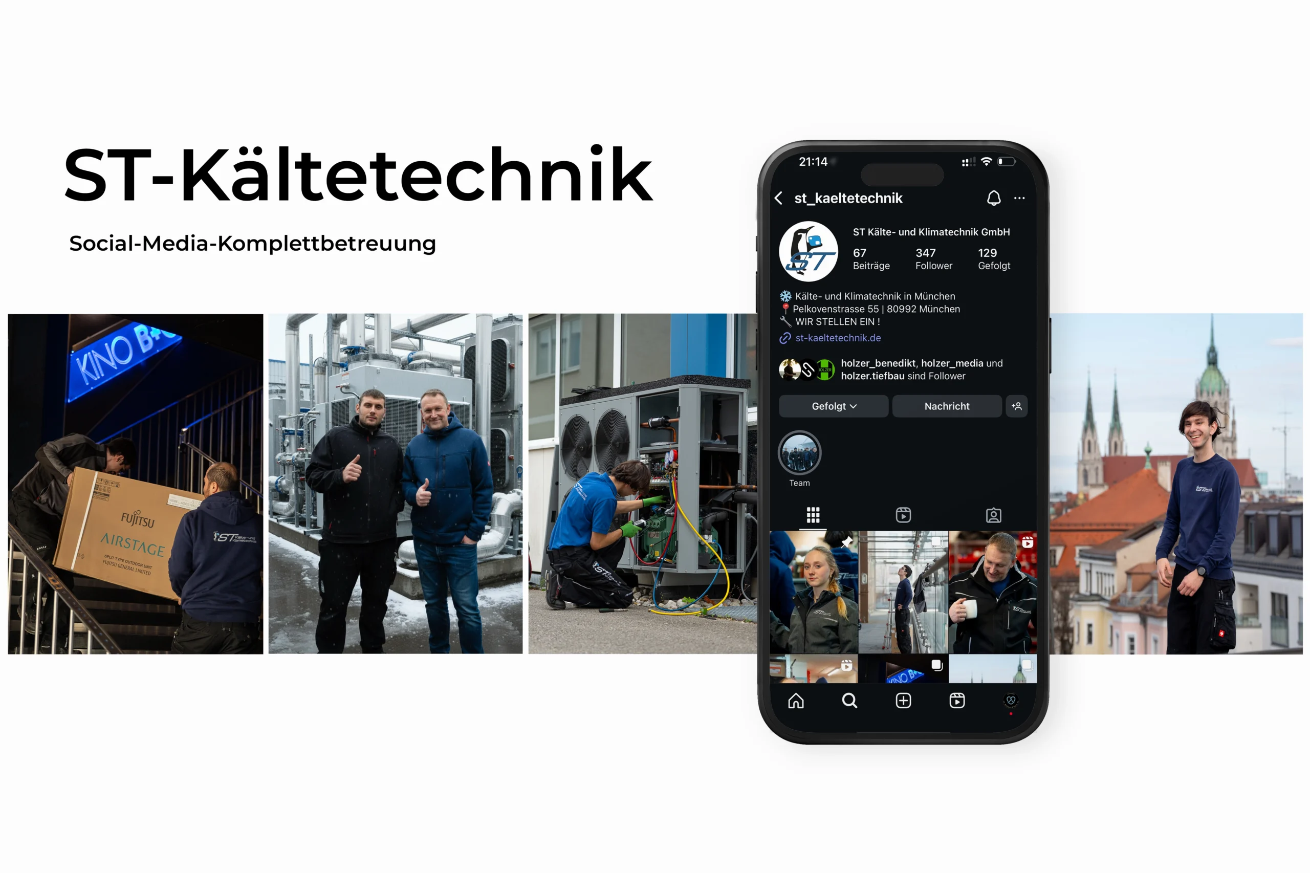 Seit September 2025 betreuen wir die ST Kälte- und Klimatechnik GmbH im Rahmen einer ganzheitlichen Social-Media-Komplettbetreuung. Durch kontinuierliche Content-Produktion und gezielte Recruiting-Maßnahmen stärken wir die Online-Präsenz des Unternehmens und sprechen aktiv neue Fachkräfte im Raum München an.